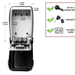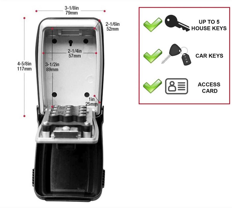Střední bezpečnostní přenosná schránka pro uložení klíčů s kovovým tělem o šířce 79 mm pro její dlouhou životnost. Přestaňte skrývat své klíče pod rohožkou nebo pod květináč. Tato schránka s velkými tlačítky je velmi snadno použitelná i za zhoršených světelných podmínek, s rukavicemi, staršími lidmi nebo dětmi. Nastavte si vlastní kombinaci až 12 písmen, číslic nebo obojí pro bezklíčové pohodlí a zvýšení bezpečnosti. Pohodlný mechanismus uzamčení tlačítka ve známém formátu alfanumerické klávesnice. Konstrukce na zeď umožňuje trvalou instalaci. Ochranný povětrnostní kryt zabraňuje zamrzání a zasekávání. Tvarované tělo a vinyl zabraňují poškrábání.