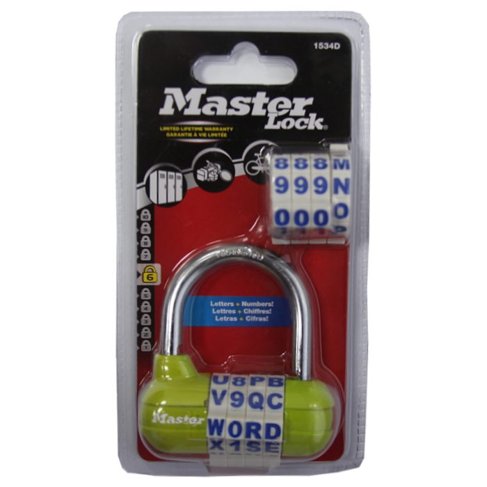 Horizontální visací kombinační zámek o šířce 64 mm má kovové tělo, které je odolné proti poškození. Jeho třmen je vyroben z kalené oceli o průměru 7 mm a je odolný proti přeřezání. Ochrana proti shimmingu BlockGuard™. Zámek obsahuje nastavitelnou 4-cifernou kombinaci zámku z PÍSMEN a ČÍSEL a součástí balení je její další náhradní sada navíc. Pro snadné zadávání kombinace slouží gripy. Bezpečnostní třída Master Lock™ 6.
