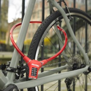 Ocelové lanko o průměru 12 mm a délce 0,90m má ergonomický tvar. Jeho vinylový potah zabraňuje poškrábání. Obsahuje integrovaný nastavitelný 4-ciferný kombinační zámek. Barva červená. Cena za kus.