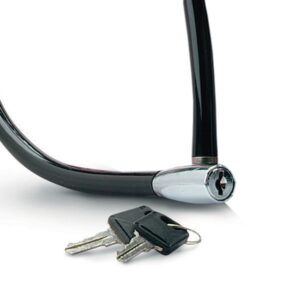 Ocelové kroucené lanko na klíč o délce 55cm a průměru 6mm má vinylový potah, který zabraňuje poškrábání. Obsahuje integrovaný zajišťovací mechanismus s válcovým klíčem, součástí balení jsou 2ks klíčů. Barva černá. Cena za kus.