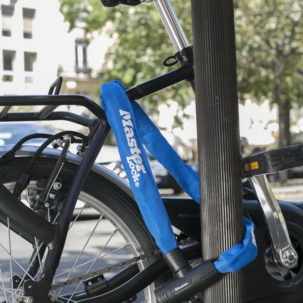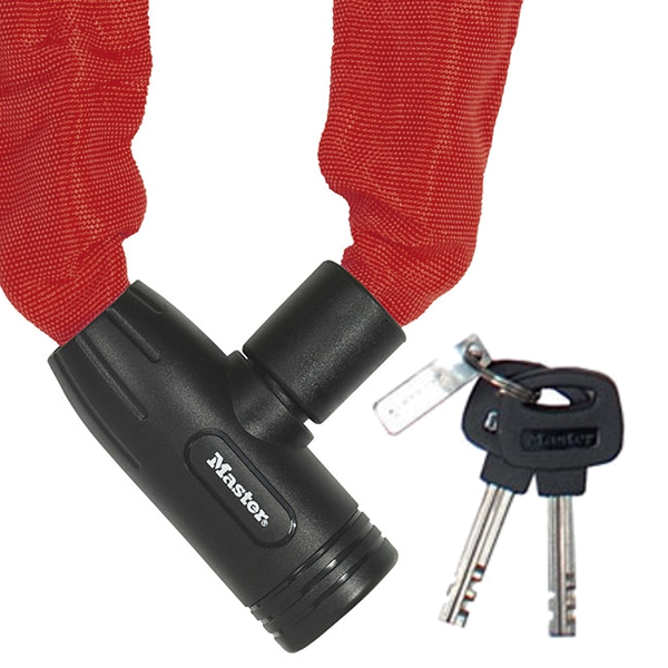 Zpevněný ocelový řetěz s integrovaným zámkem na klíč je 90 cm dlouhý a obsahuje ocelové spojky o průměru 8 mm, které odolávají řezání. Nylonový kryt řetězu zabraňuje poškrábání. Zámek obsahuje integrovaný cylindr s válcovým kotoučem pro vysoký stupeň zabezpečení. 2 ks klíčů součástí balení.
