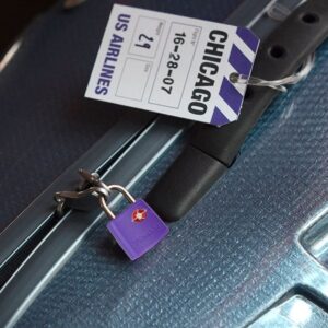 Set 2 ks visacích zámků o šířce 23 mm pro zavazadla, schváleno agenturou TSA. ABS plastové tělo zámku obsahuje cylindrickou vložku se 3 stavítky se společným klíčem, jeho třmen je z oceli o průměru 3 mm. Barva fialová. Cena za set.