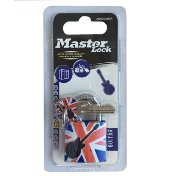 Visací zámek 3430EURDGUITAR pro všeobecnou ochranu z pevného hliníku o šířce 30 mm. Hliníkové tělo zámku s potahem odolné proti poškození a korozi. Třmen z oceli o průměru 5 mm odolný proti přeřezání. Nabízíme ve 4 možných variantách s různými potisky.
