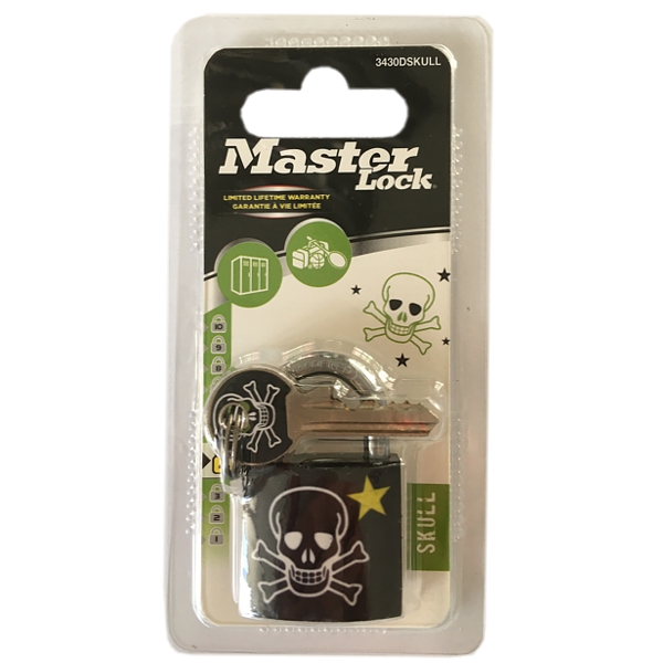 Visací zámek 3430EURDSKULL pro všeobecnou ochranu z pevného hliníku o šířce 30 mm. Hliníkové tělo zámku s potahem odolné proti poškození a korozi. Třmen z oceli o průměru 5 mm odolný proti přeřezání. Nabízíme ve 4 možných variantách s různými potisky.